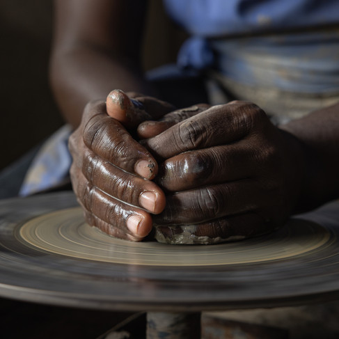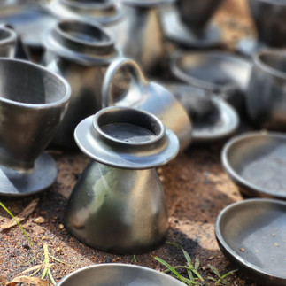 pottery. Today, he shapes each cup by hand - one of the few artisans still practising this fire-finish technique in Uganda.