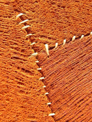 During the rainy season, the inner bark of the Mutuba tree (Ficus natalensis) is harvested and beaten with various wooden mallets to achieve a soft, fine texture and a consistent terracotta colour. The craftsmen work in an open shed to prevent the bark from drying too quickly.